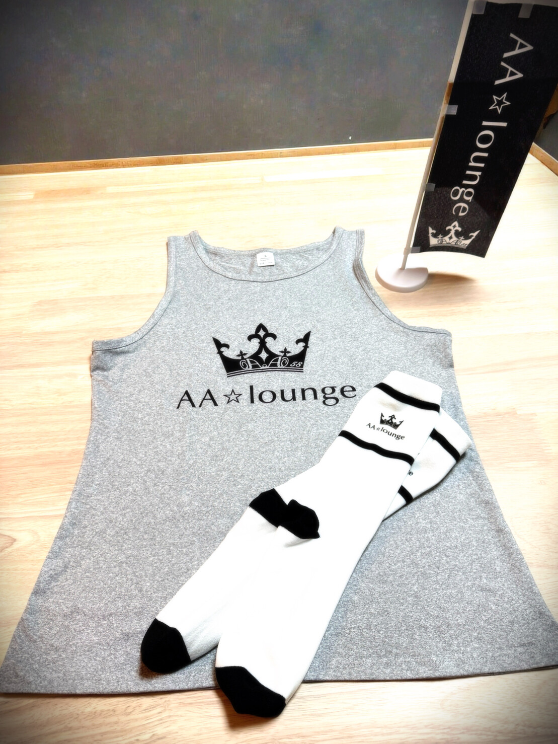 AA-loungeロゴ入りのグレーのタンクトップと、白のロング靴下がセットになった新アイテムです。