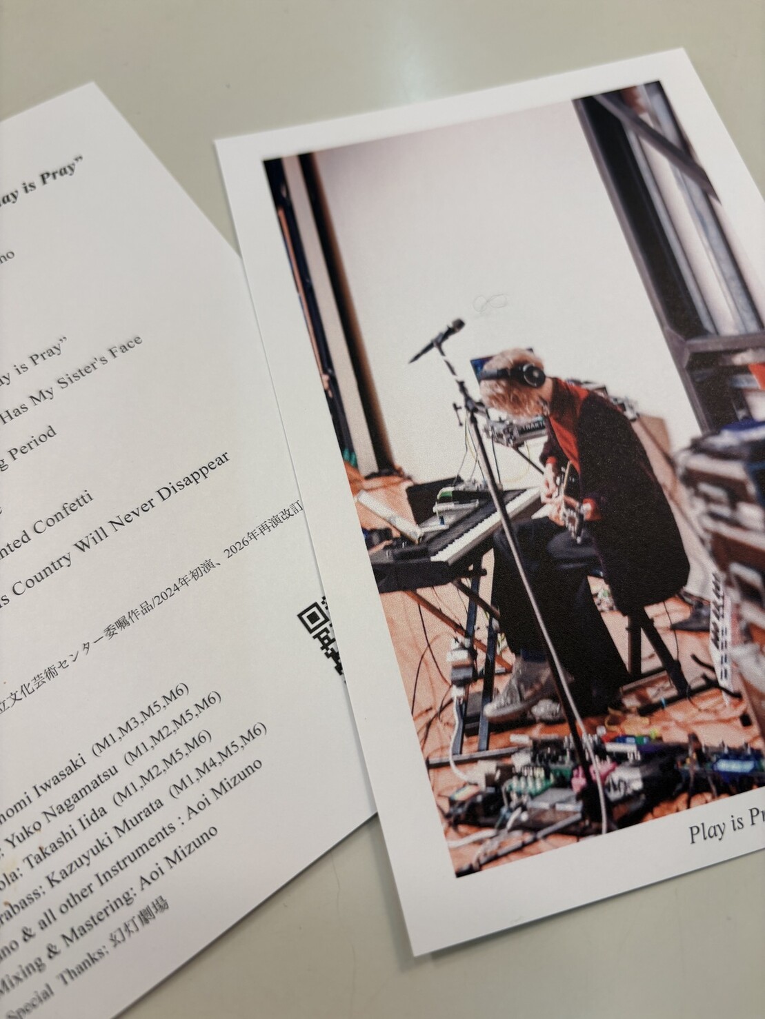 水野蒼生が作曲、演奏を担当した戯曲「Play is Pray」の初演時(2024年)デモ音源のダウンロードコード付きポストカードです。