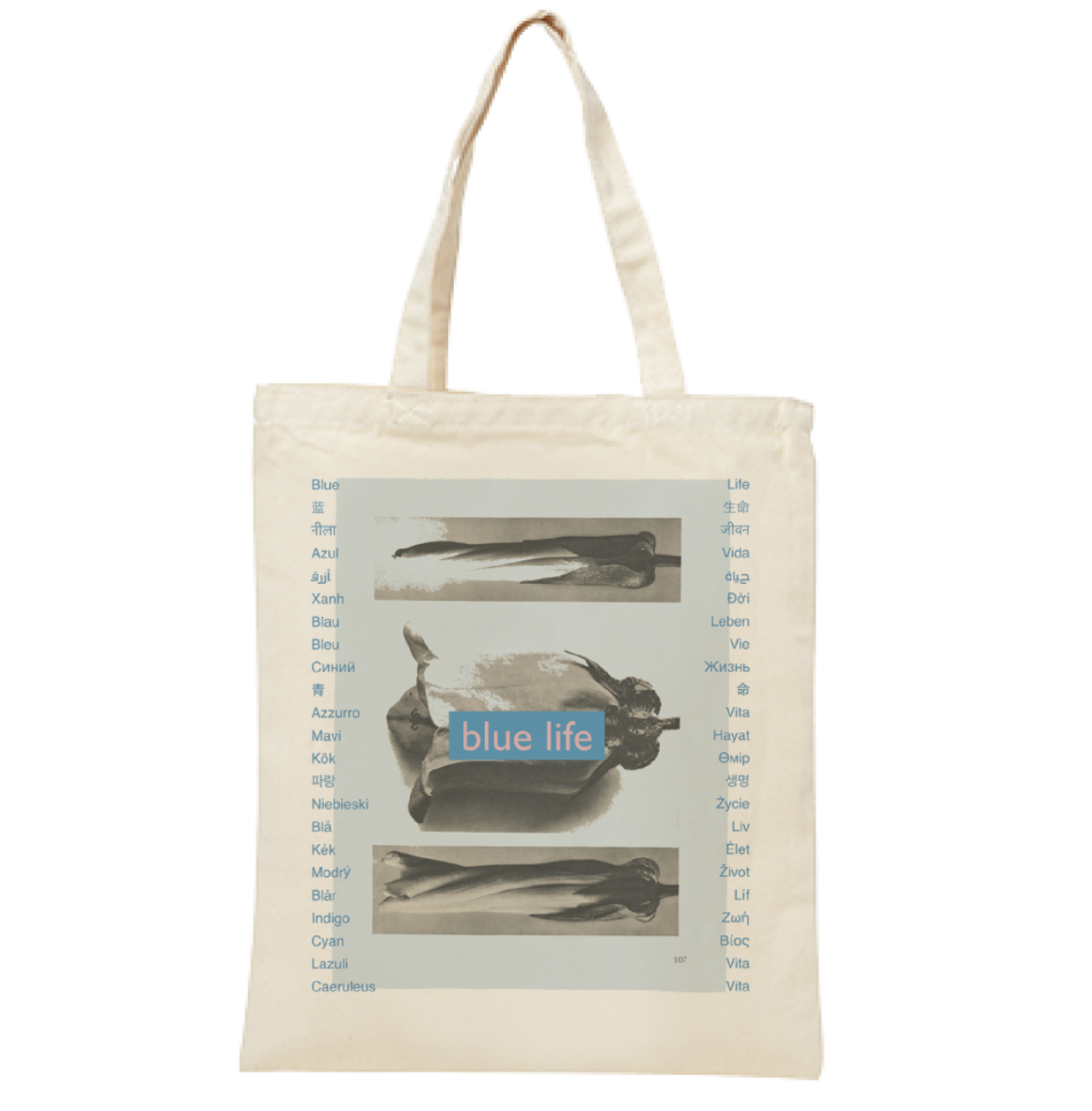 世界中の様々な言語でblueとlifeをあしらった、ユニークなデザインが特徴の大型キャンバストートバッグ。8Ozの厚みのある丈夫な生地で日常使いにぴったりの一品。