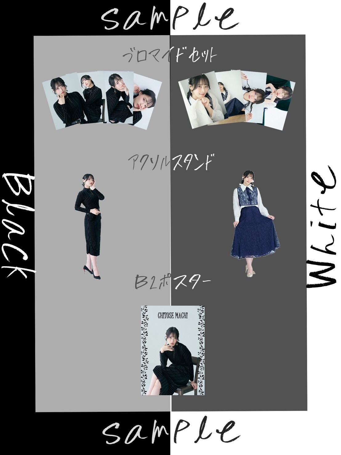※デザインはポスターの写真と同様です。 ※ポストカードをご希望の方はオイデマセチトセ ブラック&ホワイトからご購入ください。 ※単体ごとの購入は対象外です。 ▼セット内容 ・Lブロマイド4枚1組セット ・75×100mmアクスタ ・B2ポスター ・ロゴシール(通販特典) ・ポストカード(両セット購入特典)