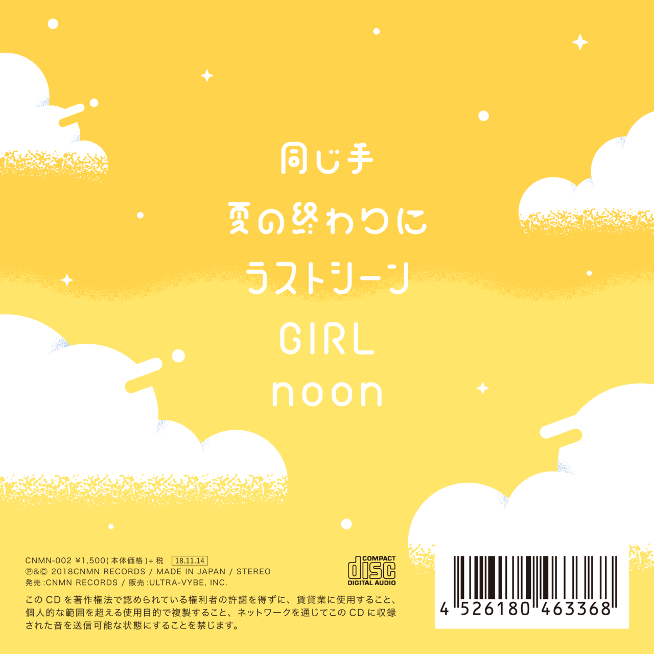 2018.11.14 Release ¥1,500(+tax) CNMN-0021.同じ手2.夏の終わりに3.ラストシーン4.GIRL5.noon発売 : CNMN RECORDS / 販売 : ULTRA-VYBE, INC.[販売店舗] 全国のタワーレコード、ヴィレッジヴァンガード、HMV、TSUTAYA 等レコードショップにて