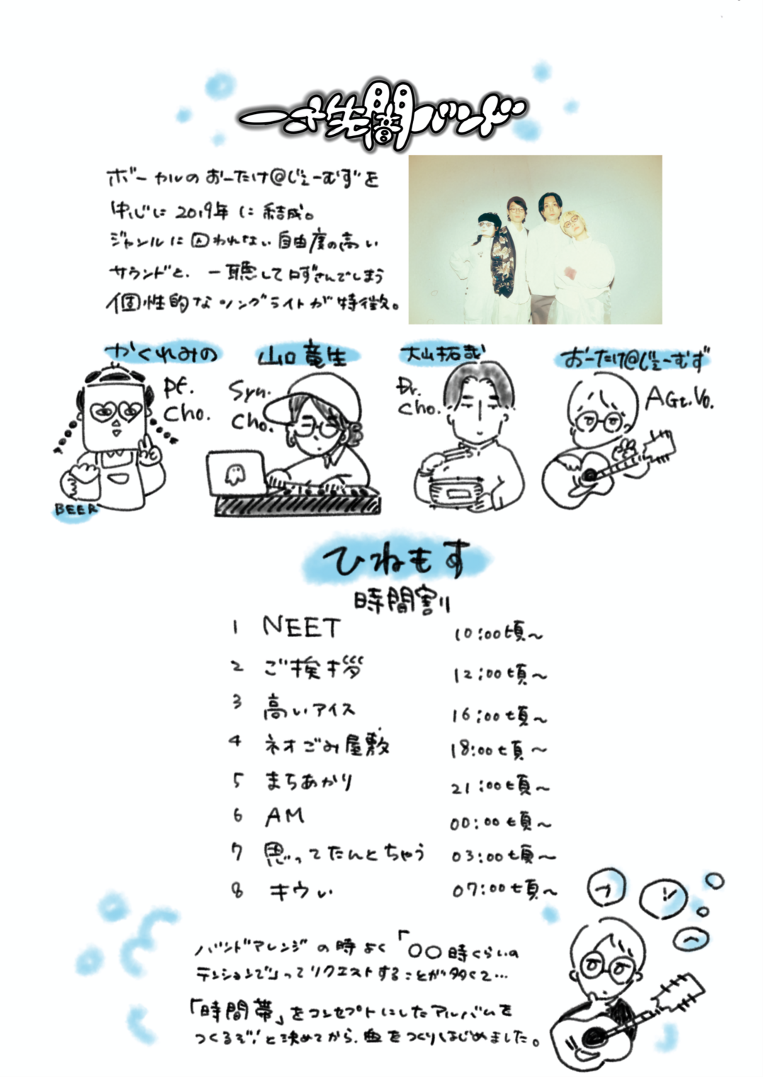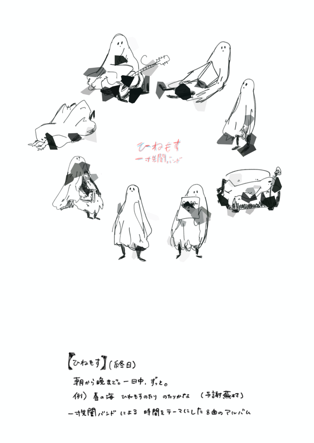 一寸先闇バンド、初めてのフルアルバム『ひねもす』に収録されている楽曲の歌詞や解説、裏話などを掲載。