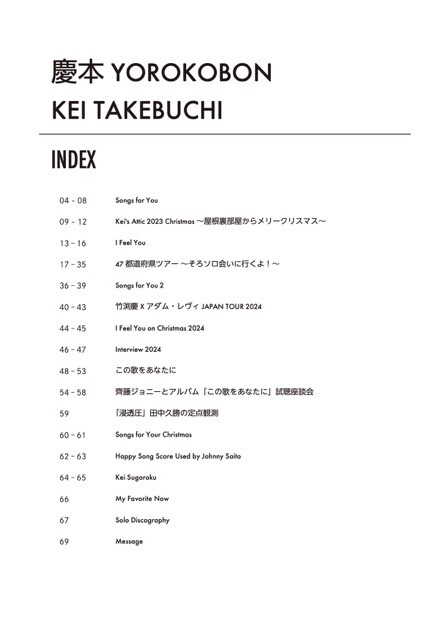 竹渕慶の本ついに登場!近年、竹渕慶の新たなフェーズともなる、2023年「Songs for You」リリースから彼女を取り続けいているカメラマン冨田望によるフォトセッション初出し写真から、各ライブ写真、47都道府県ツアー全会場記念写真、ライター田中久勝による過去インタビュー、書き下ろしインタビュー、盟友齊藤ジョニーとのアルバム「この歌をあなたに」視聴対談、竹渕慶すごろく、Happy Song齊藤ジョニー実使用譜面、竹渕慶マイフェイバリットナウ等、今の竹渕慶を余すところなくたっぷりお届けします!