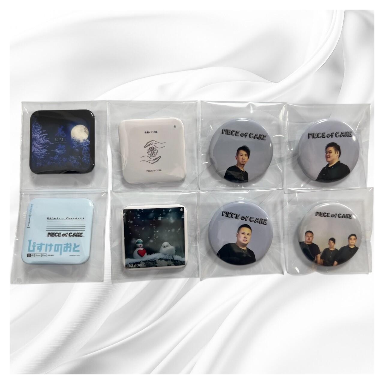 2nd ALBUM「ぴすけのおと壱」用に作られた、グループショット、3人それぞれのソロショット、アルバムのジャケット、そして今回収録されているシングルのジャケット、合計8種類の缶バッジ。