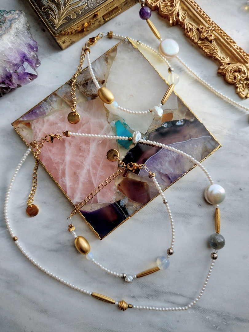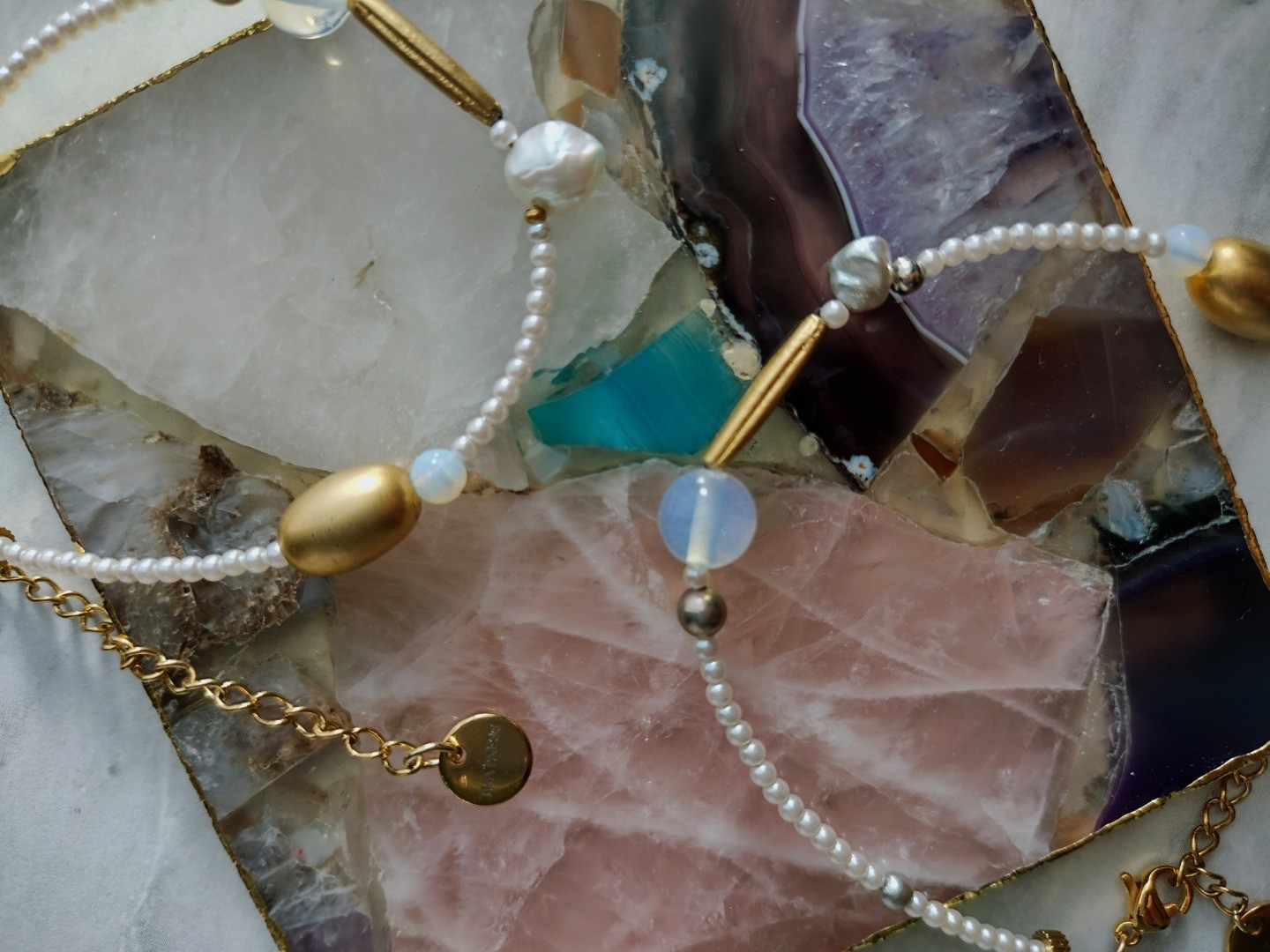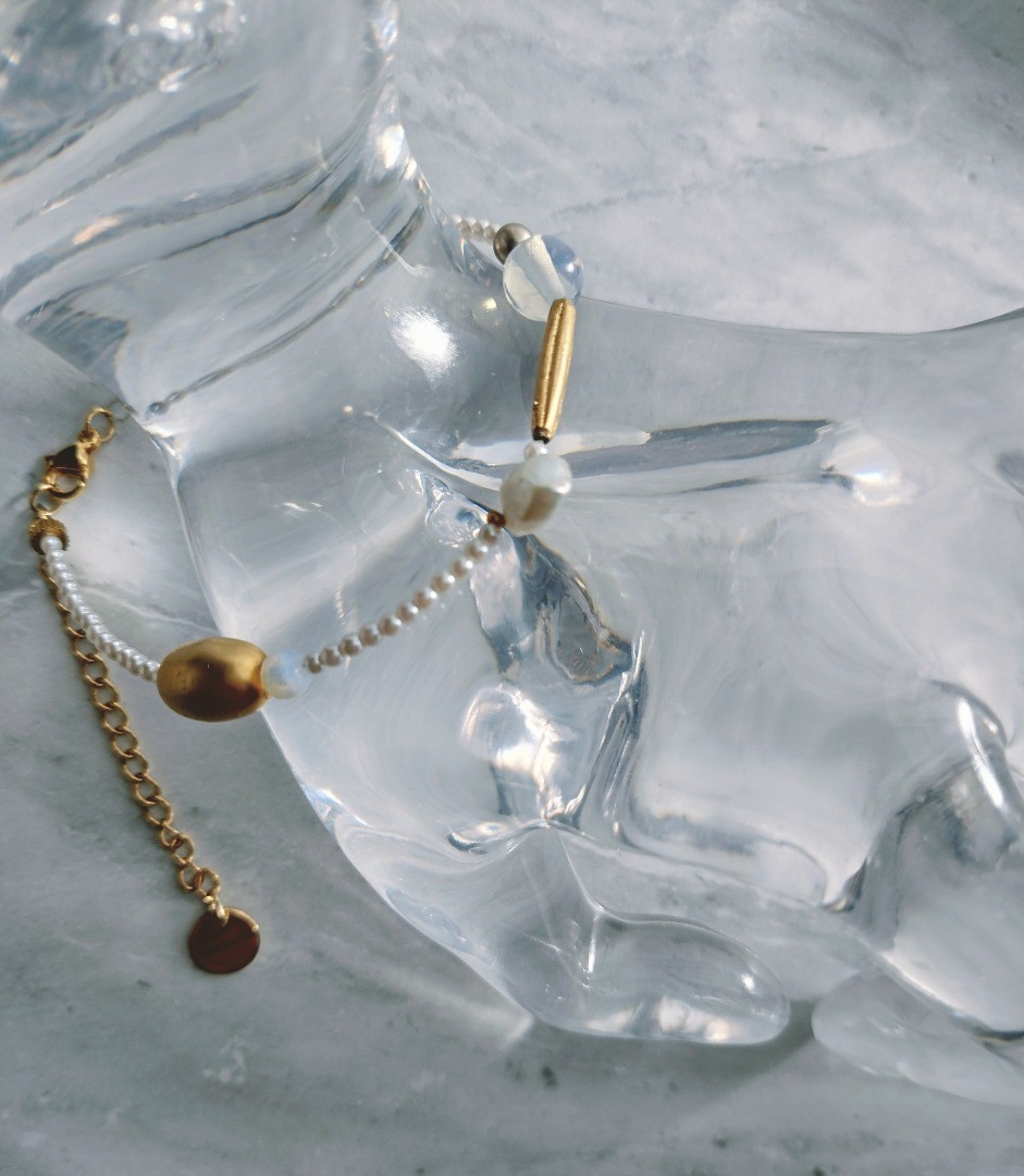 照りがうつくしいアクリルパールに、ホワイトオパールカラービーズと天然パール、ヴィンテージパーツをランダムに組み合わせた腕飾り。