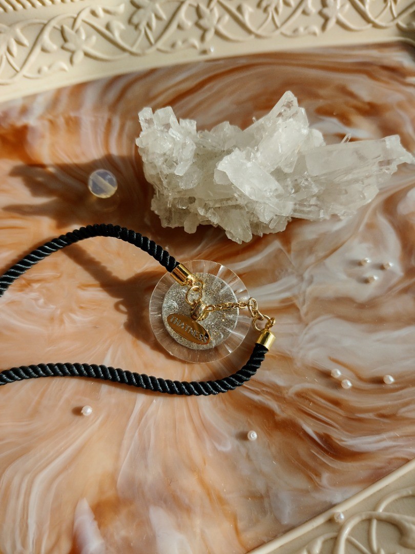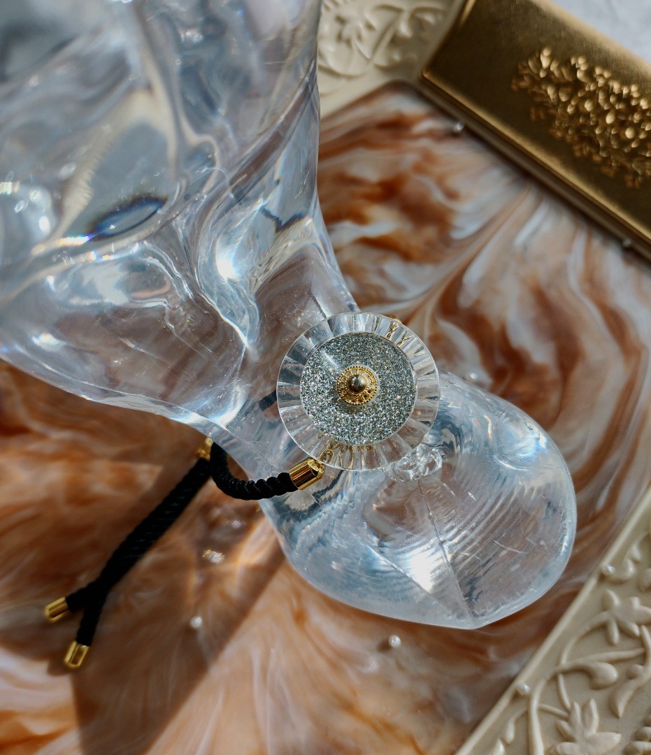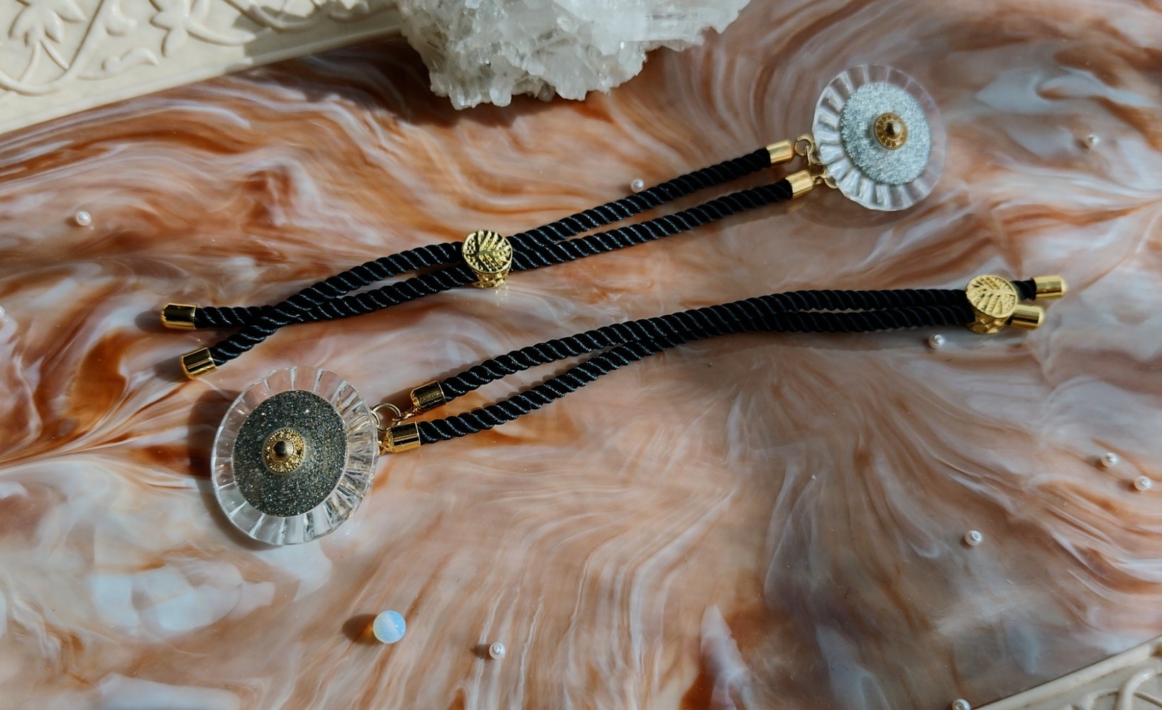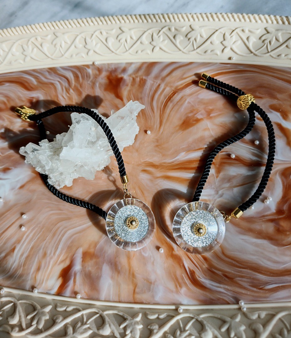 クリアさが目を引くヴィンテージボタンを使用した、ロープ調サテンの紐を使用した腕飾り。