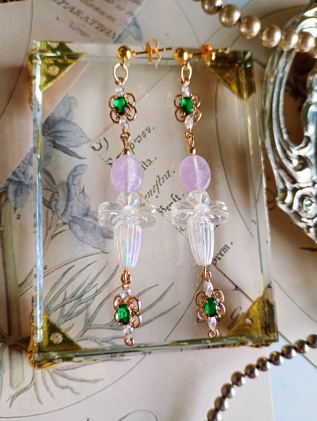ラベンダーアメシストのビーズ、ホワイトオーロラのヴィンテージアクリルパーツ、グリーンのジルコニアストーンは、それぞれ男性性/女性性の2元的な性質にとらわれない、ジェンダーの中を流動的にうつろうクィアであるという意味を込めて選択しました。