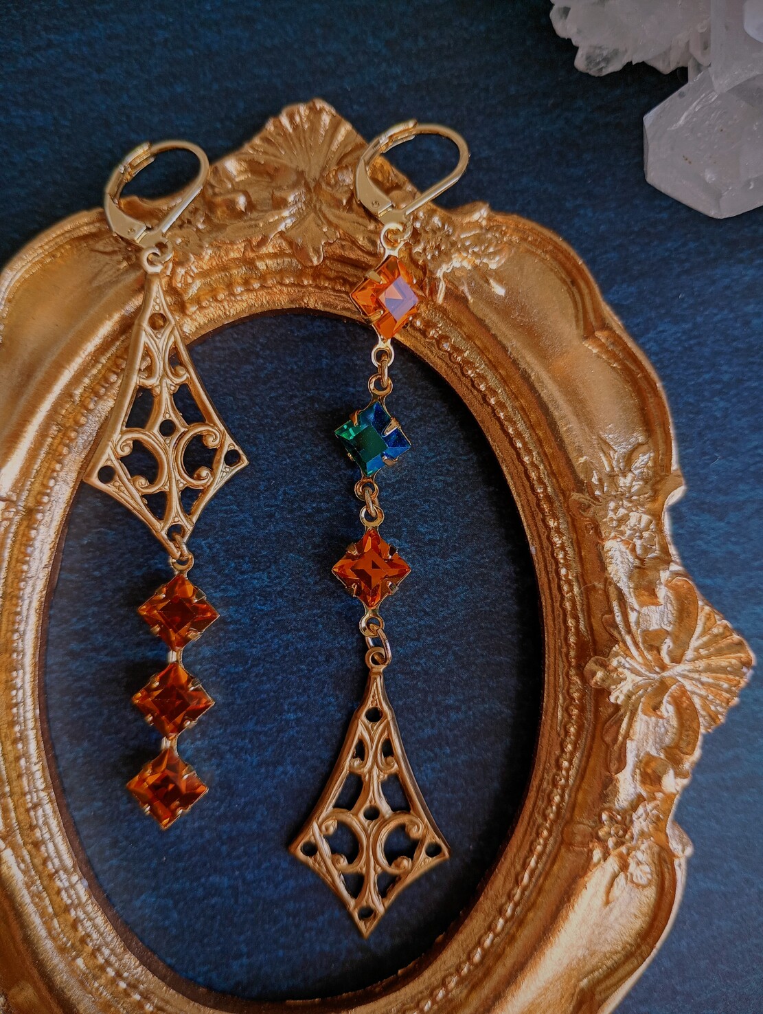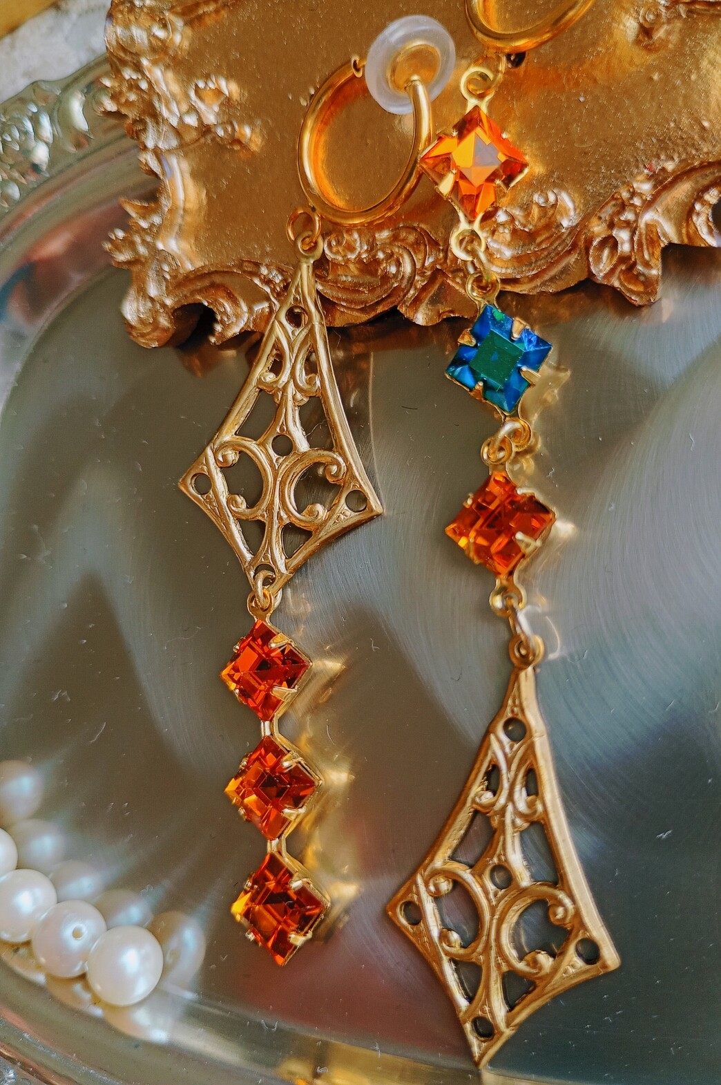 輝く夕空の色合いをイメージした、ブラスのフィリグリーとヴィンテージスワロフスキーの耳飾り。