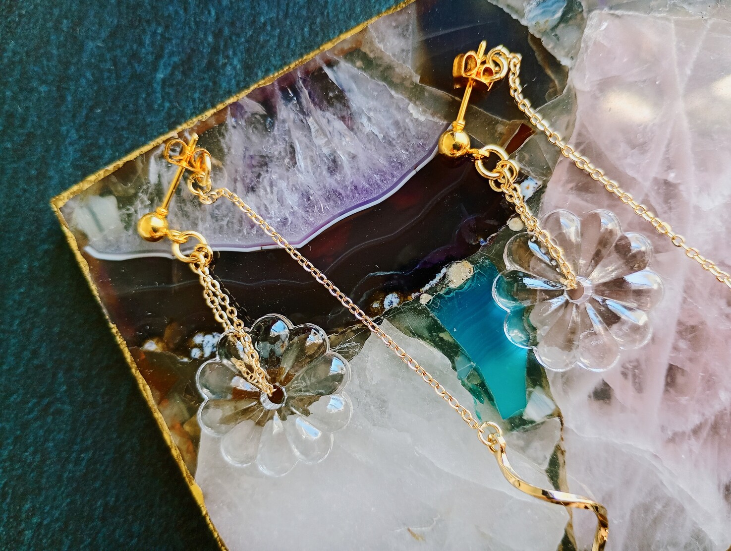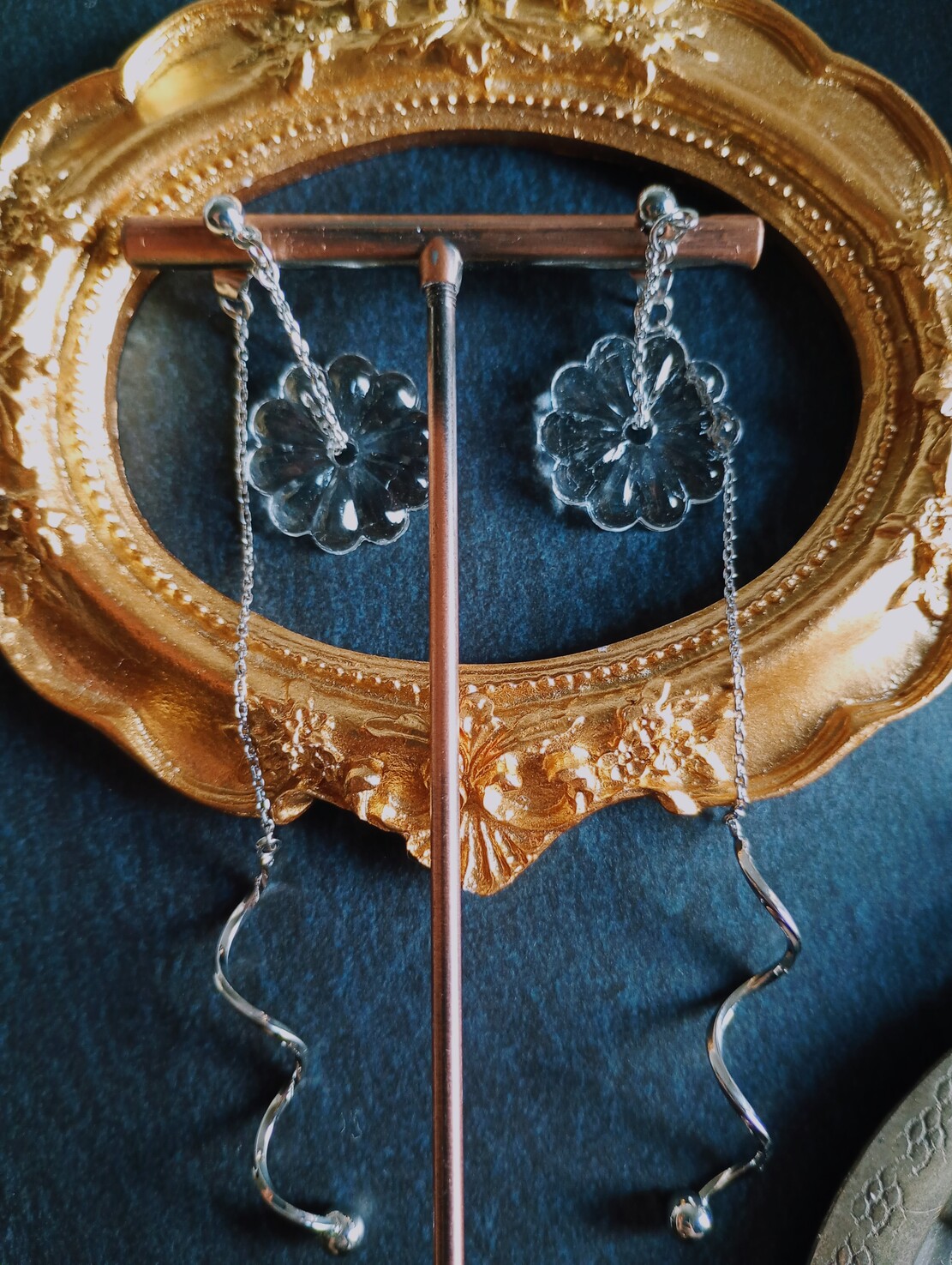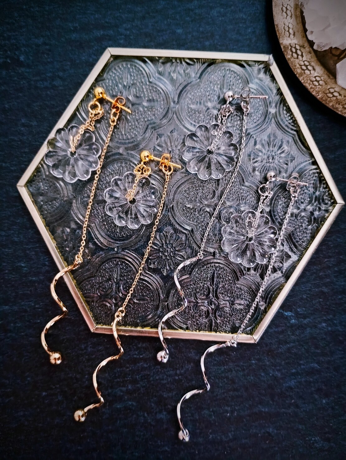 透き通るガラスのフラワーモチーフを使った2wayタイプの耳飾り。