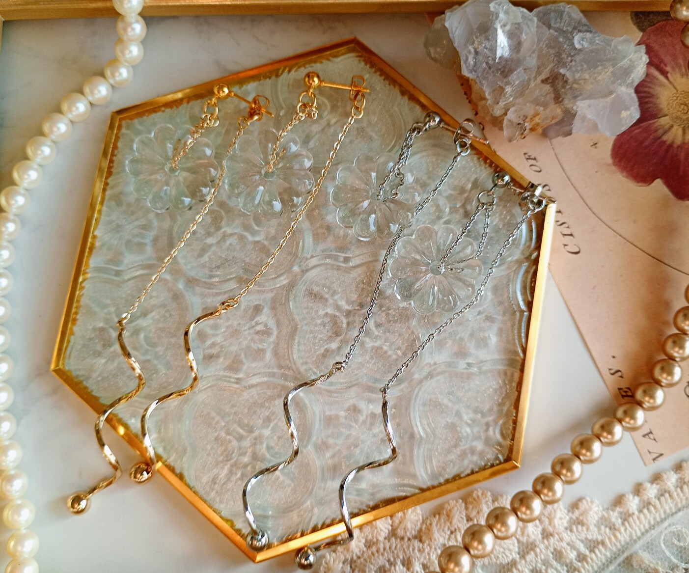 ピアスキャッチには、軽やかにゆらゆら動く流線形パーツを添えています。