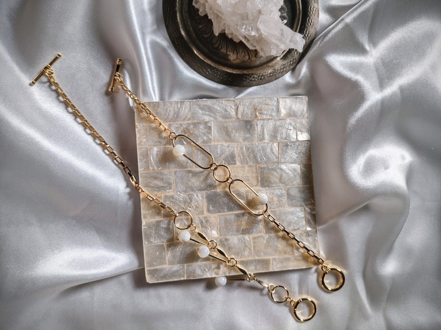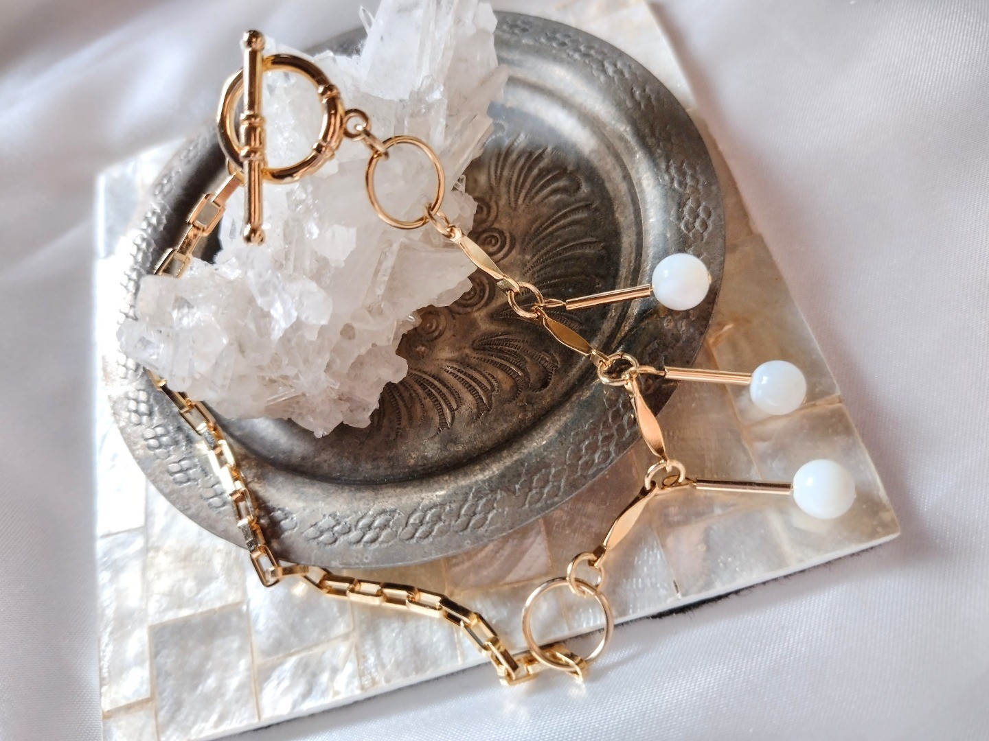 マザーオブパールと直線チューブパーツの形を組み合わせたシンプルな腕飾り。