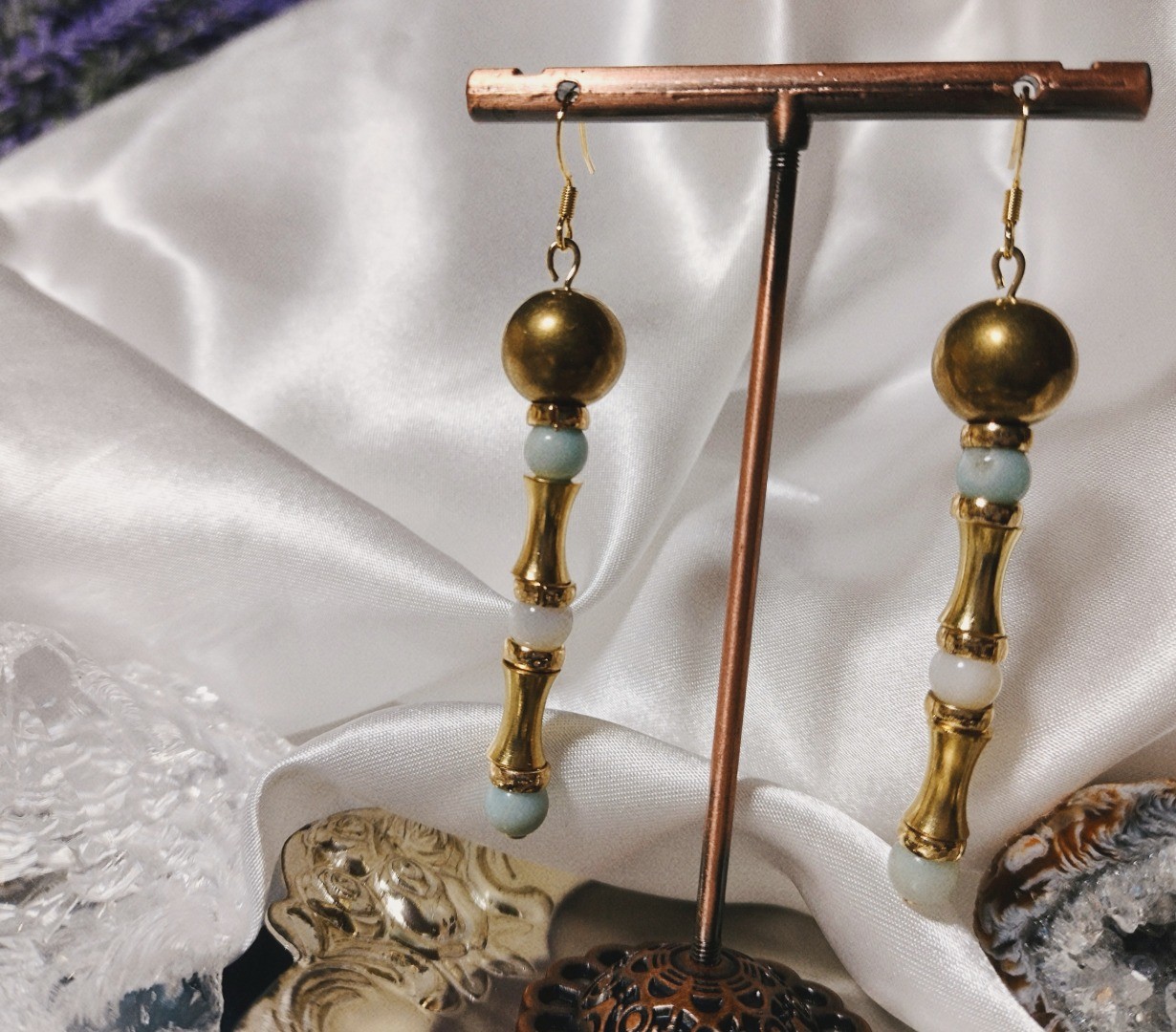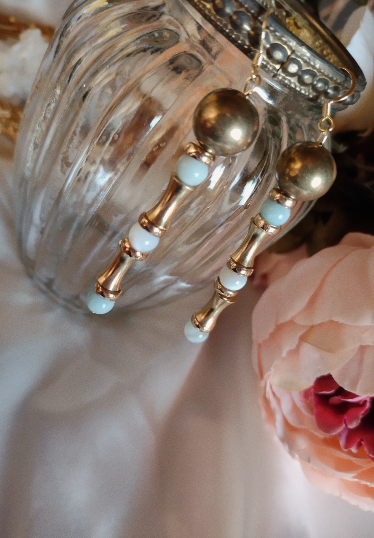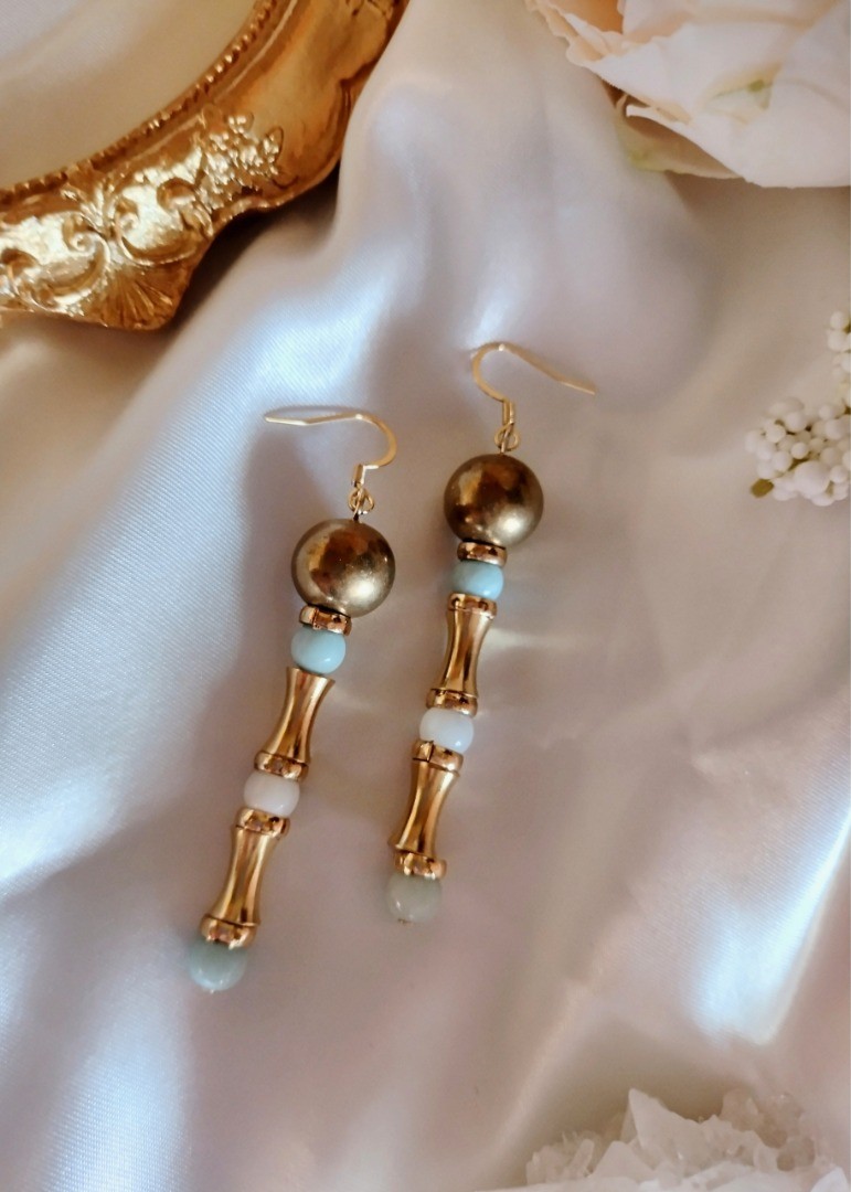渋さを帯びたメタリックなパーツと、アマゾナイトやマザーオブパールといった淡い色の天然石が柱の装飾のようなイメージを作り出す耳飾り。