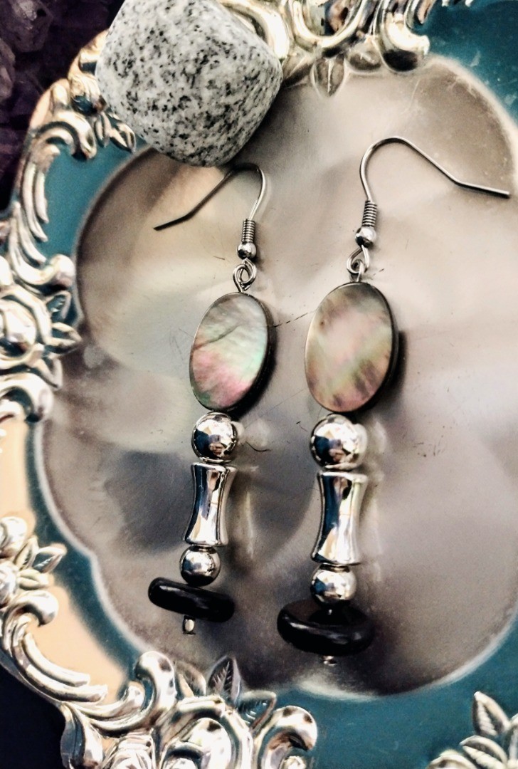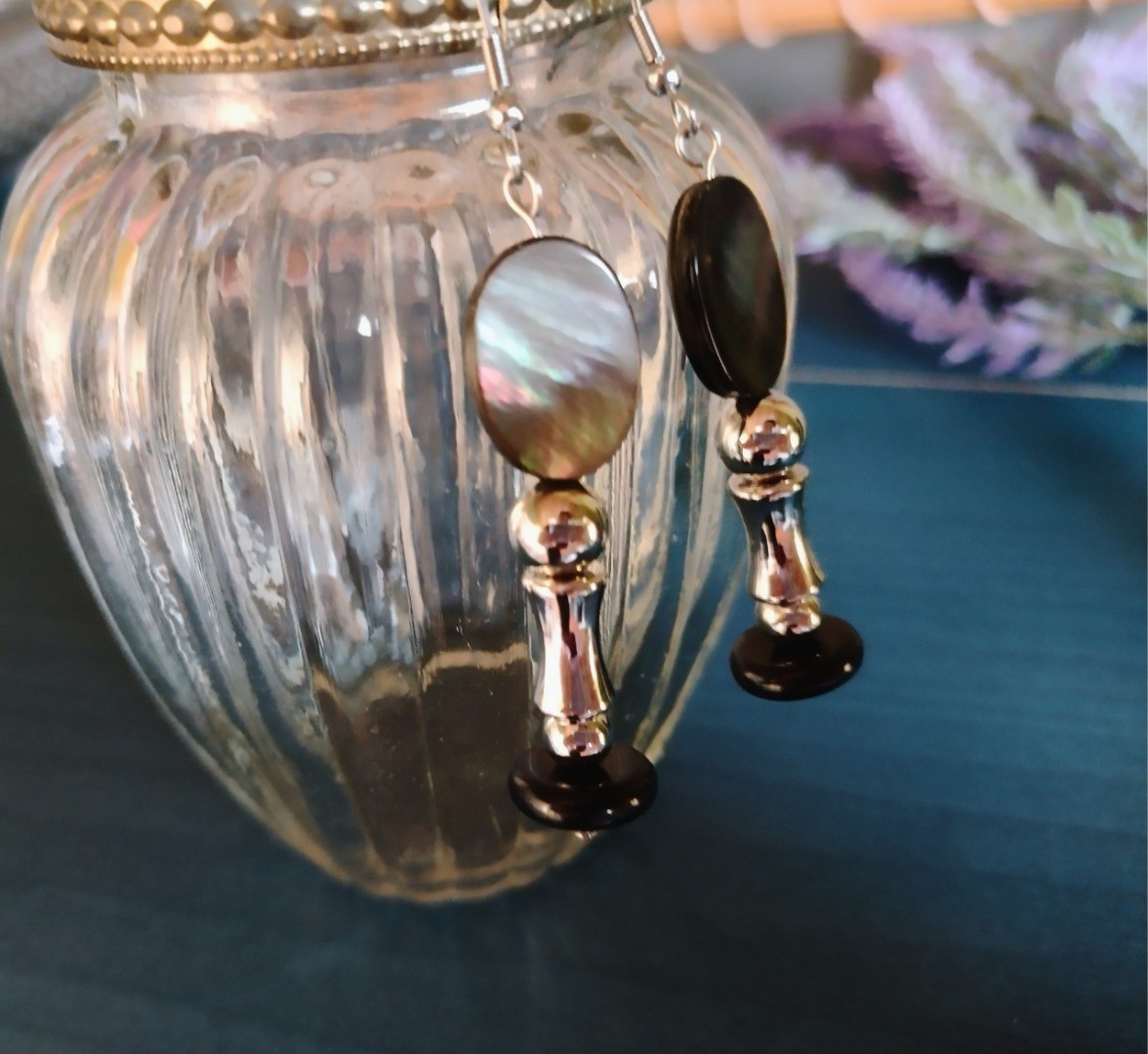 ブラックシェル(黒蝶貝)パーツが、優雅かつ神秘的なムードを醸し出す柱の装飾のような耳飾り。