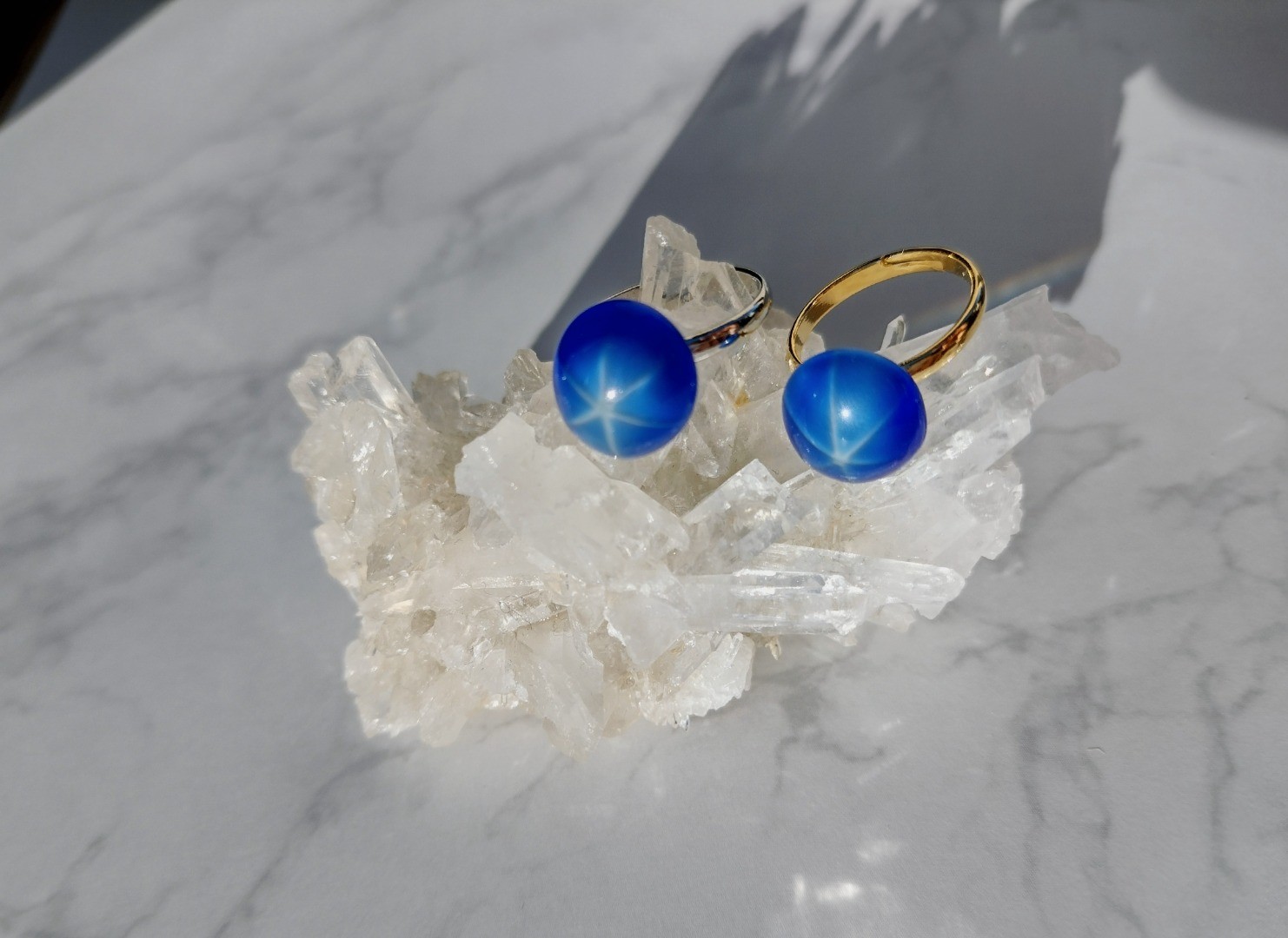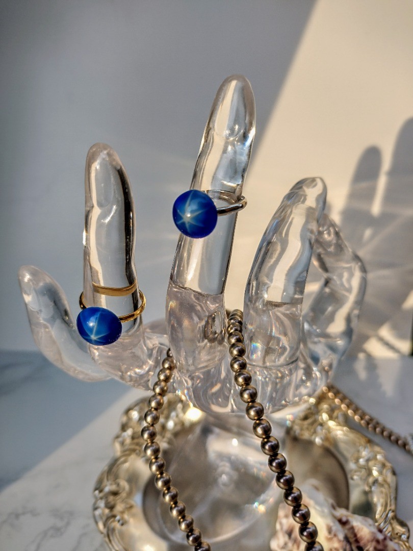 群青色のガラスの中でぼんやりと光るようなスター模様が、何かを示してくれるような指輪。鮮麗なウルトラマリンブルーのカボションは澄み切った冬の青空にも見え、暗くなりがちな冬の指先に鮮やかな彩りとコントラストを与えます。