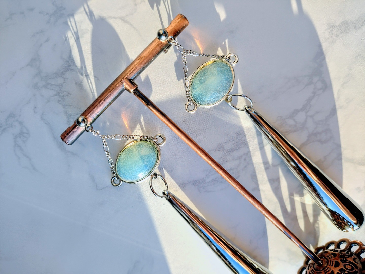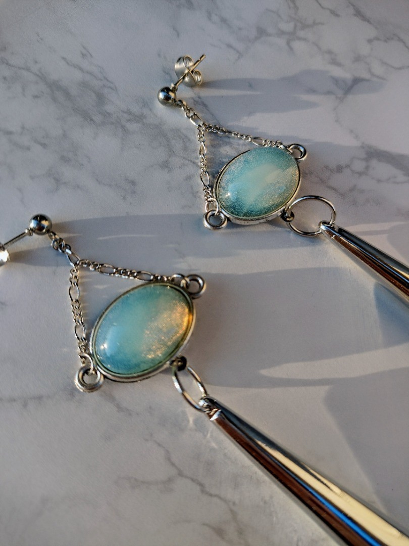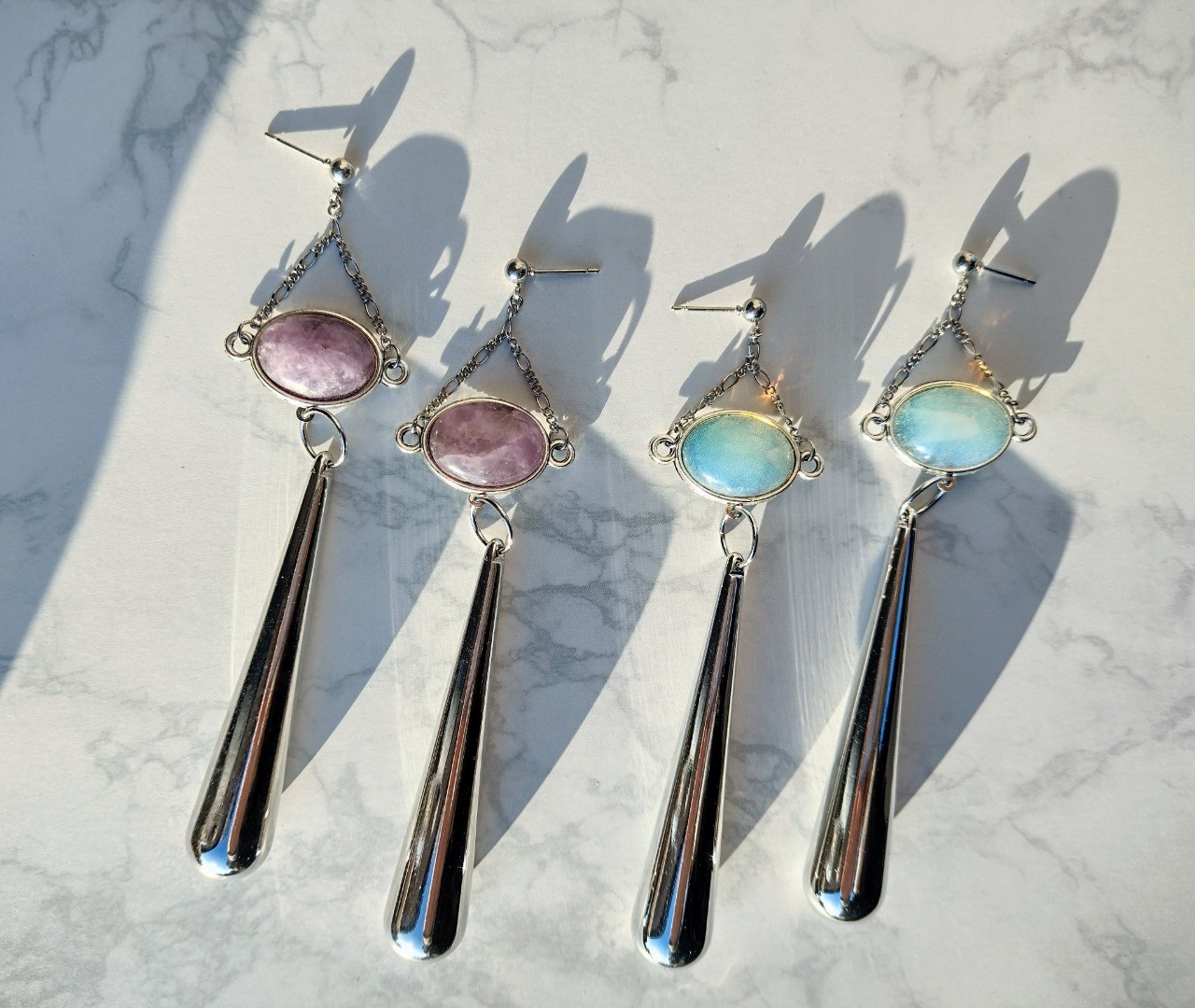 透明感が引き立つ淡い色合いのカボションと、シルバードロップの耳飾り。冬の季節にひと際輝くようなデザインと色を選びました。
