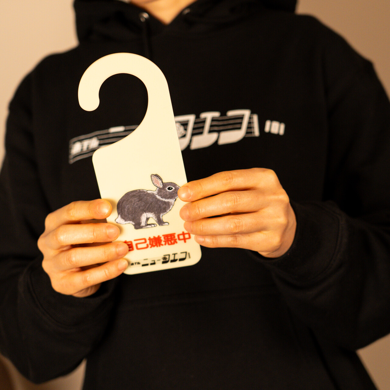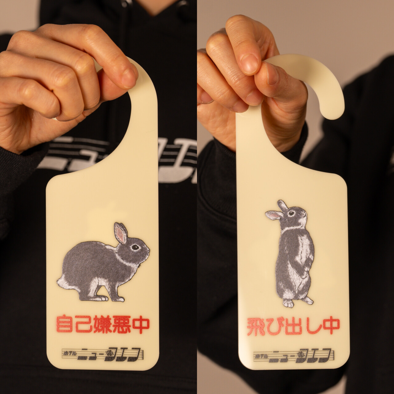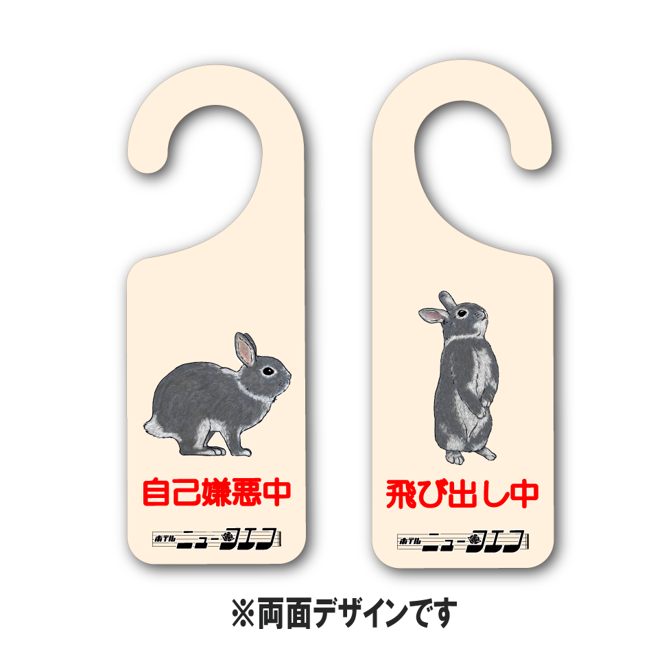 「自己嫌悪中」「飛び出し中」と表裏にデザインされた、ユニークなドアサインです。