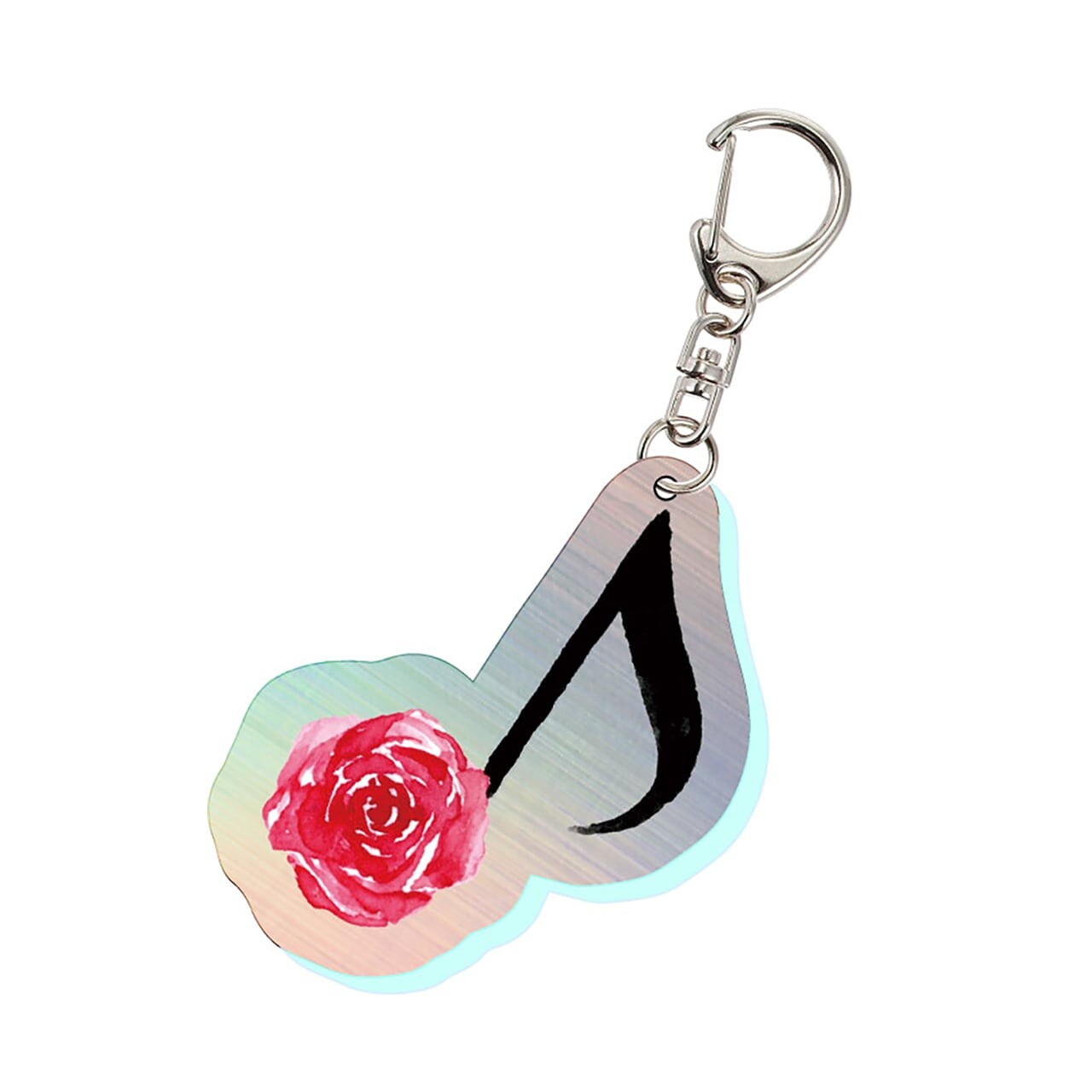オーロラのアクリルにヨエコのアイコンである薔薇の音符がプリントされたキーホルダーです。