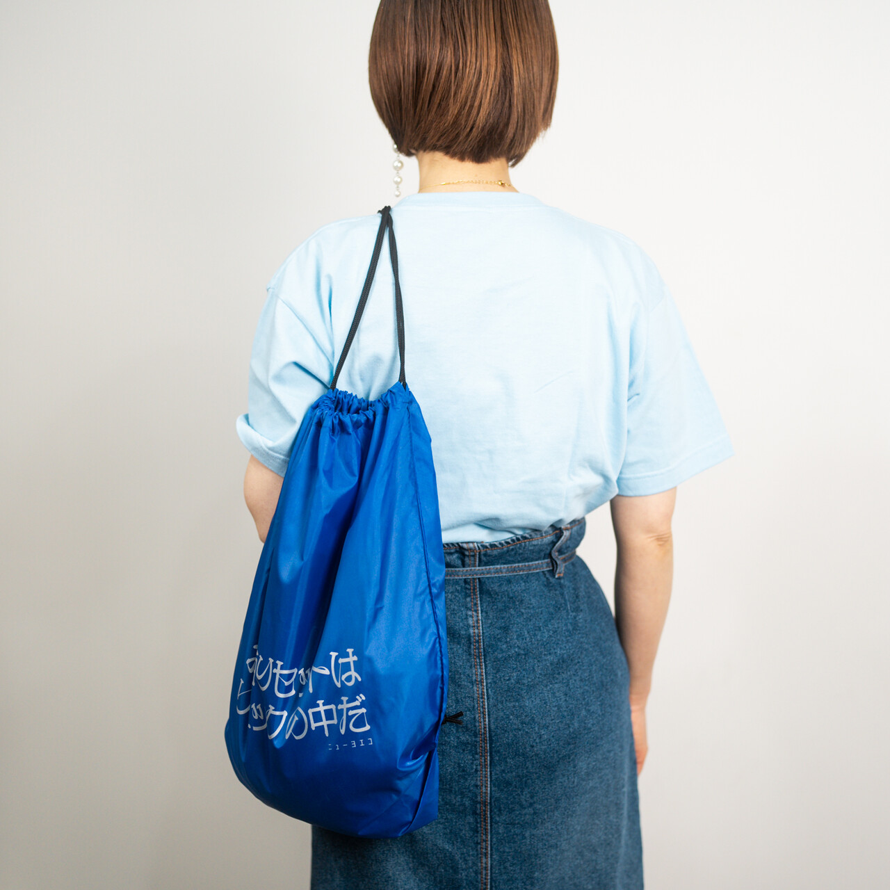 ヨエコの曲「恋愛テム」の歌詞「お泊りセットはリュックの中だ」がプリントされたナップザックです