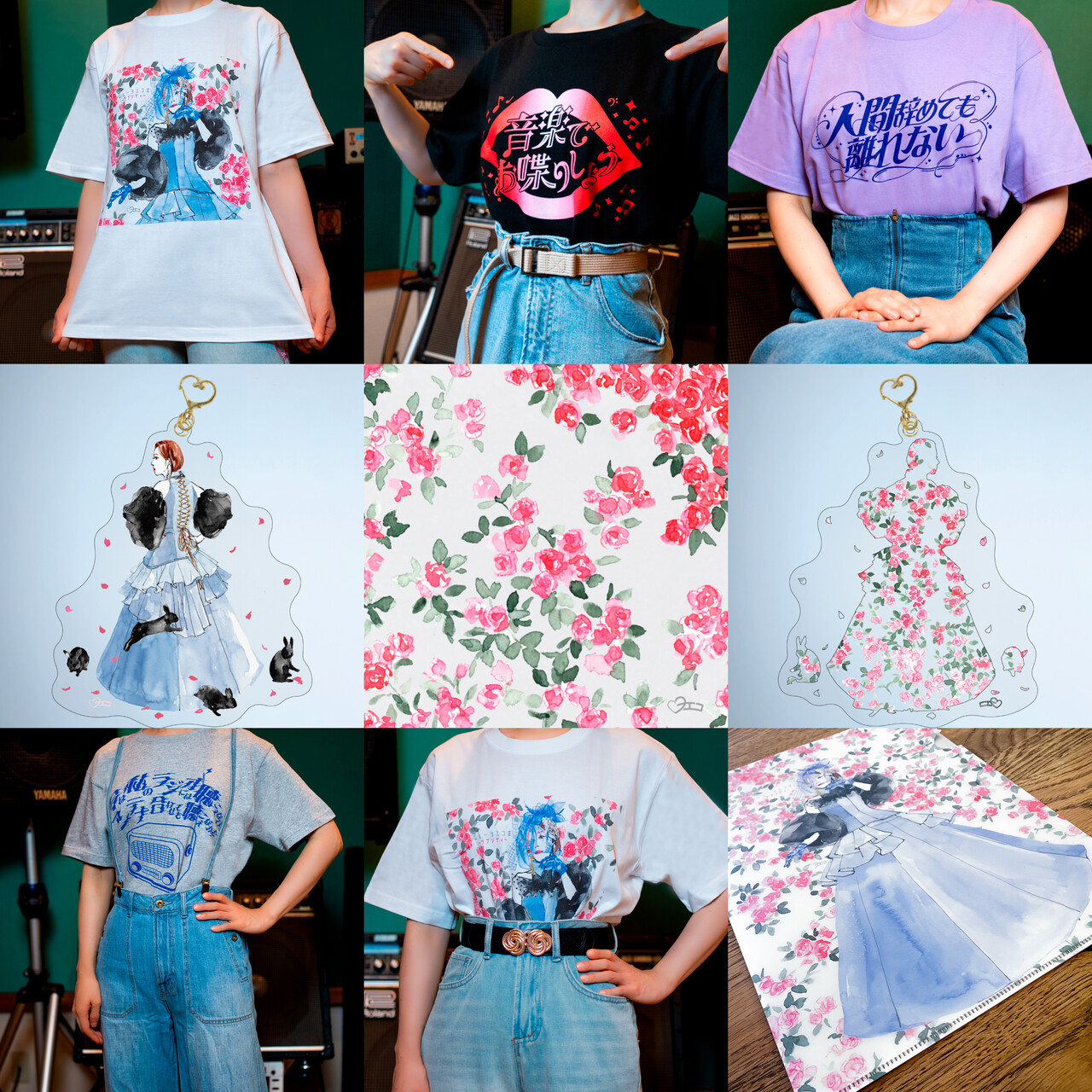 オフィシャルジャケットTシャツ「ニューヨエコⅡ〜ラプソディ〜」/「music」オフィシャル歌詞Tシャツ/「人間辞めても」オフィシャル歌詞Tシャツ/「ラジオ」オフィシャル歌詞Tシャツ/デニムドレス・オフィシャルキーホルダー/ラプソディ薔薇園フェイスタオル/ラプソディ・クリアファイル