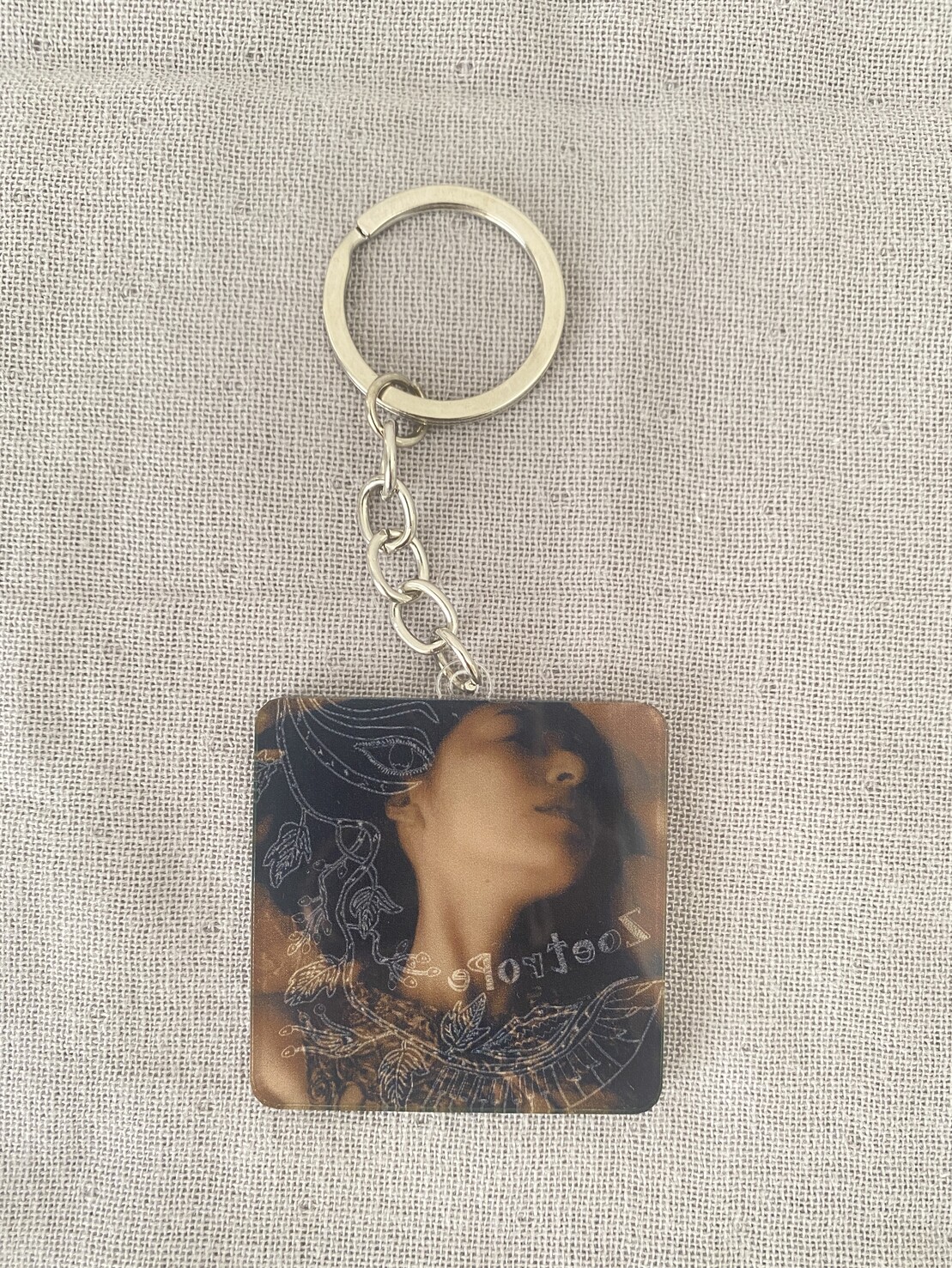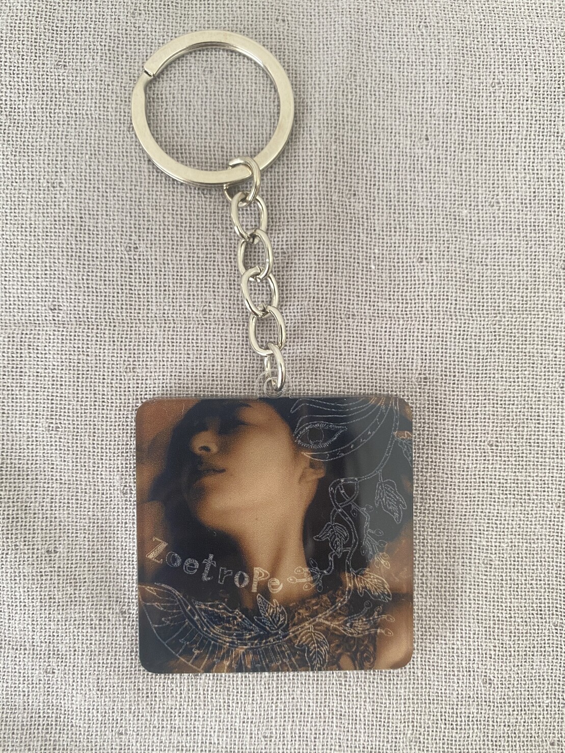 表裏プリントになっており、ミニサイズのアルバムジャケットのような正方形キーホルダー。